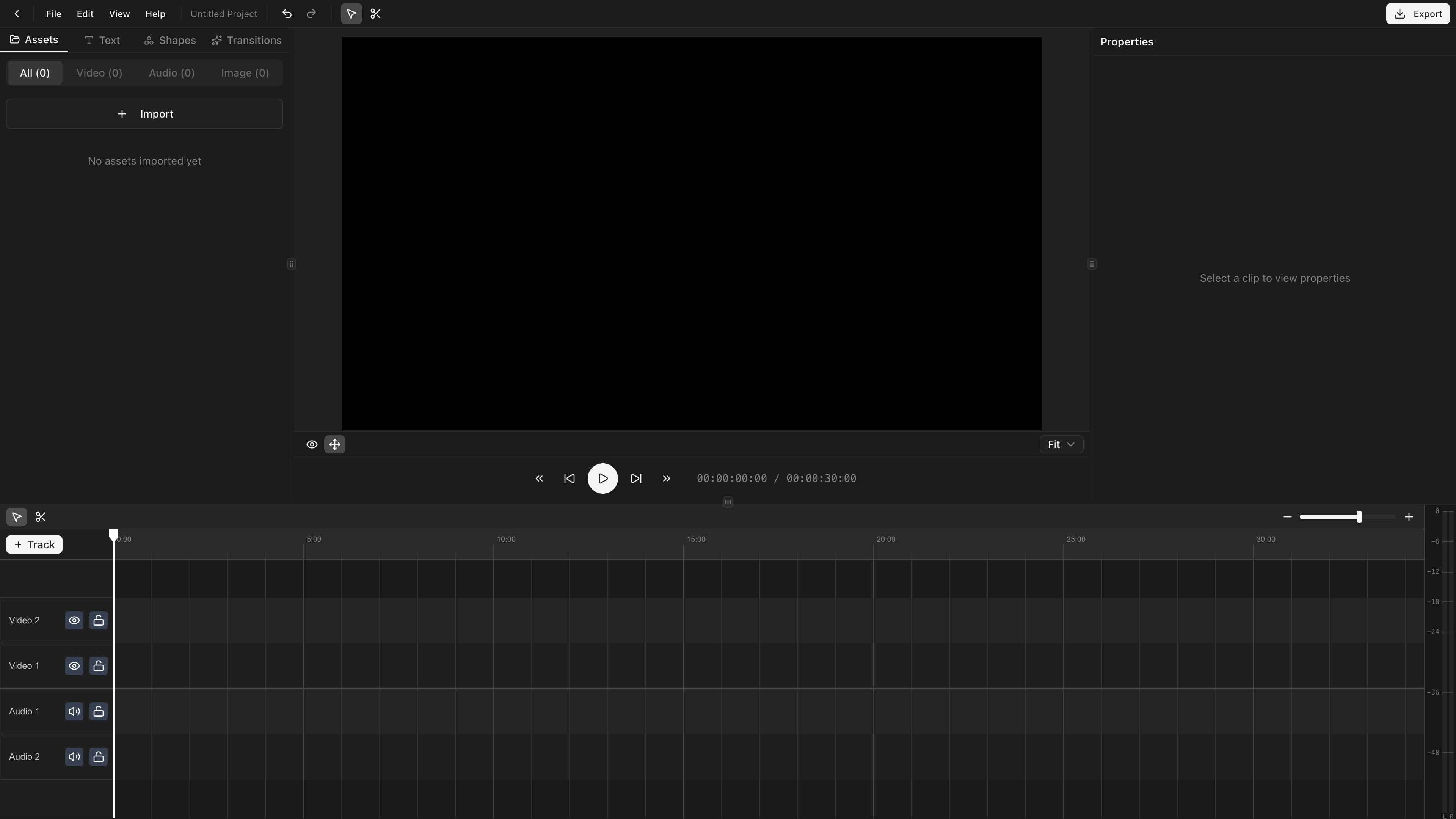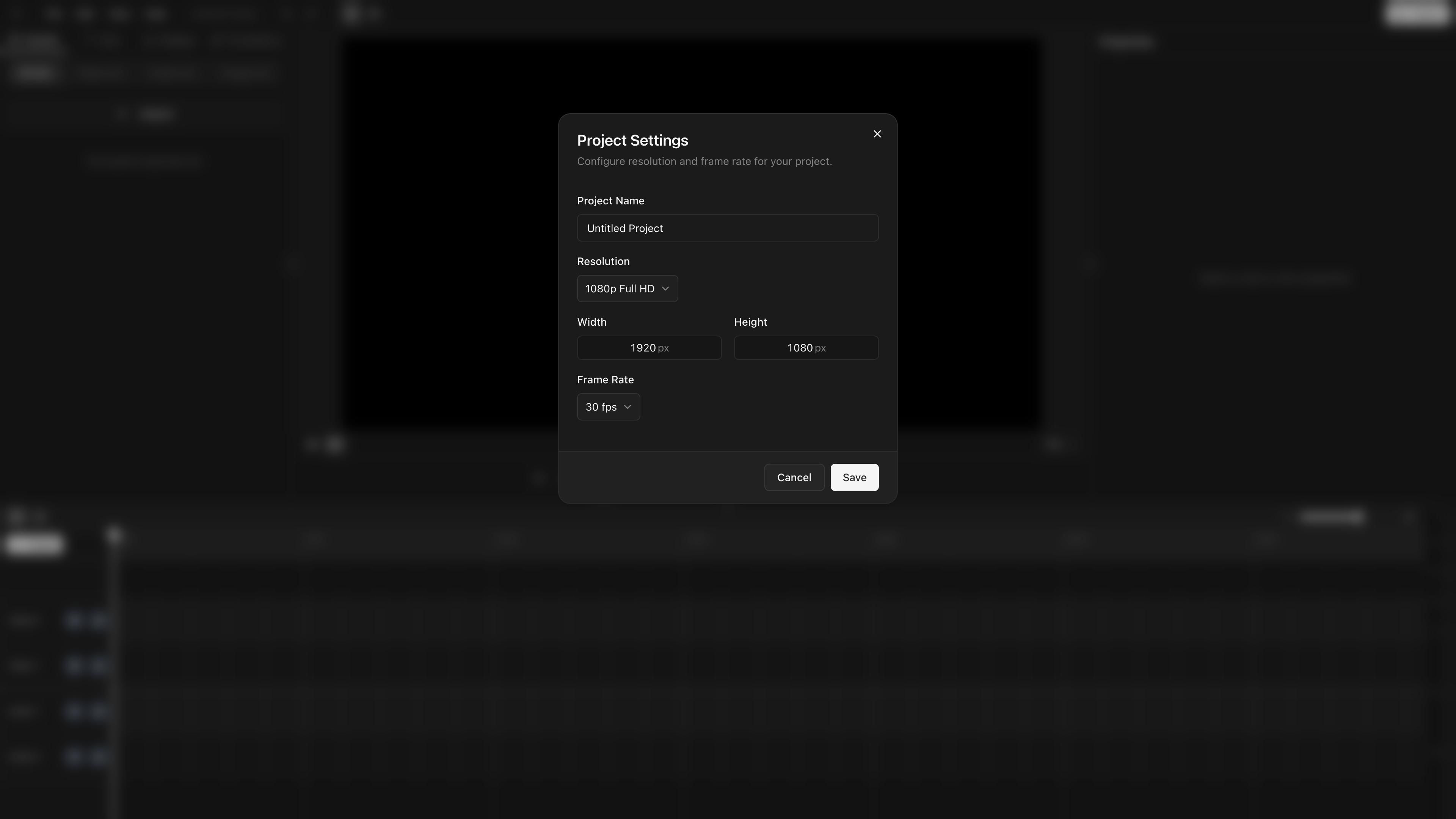 Click New project. Pick a name, resolution, and frame rate (changeable later in Project Settings).